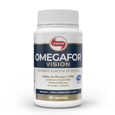 OMEGAFOR® VISION é um suplemento alimentar à base de óleo de peixe (fonte de Ômega 3-TG), com vitaminas, cisteína, taurina, luteína, zeaxantina. A vitamina A auxilia na VISÃO, no METABOLISMO DO FERRO, no processo de DIFERENCIAÇÃO CELULAR e contribui para a MANUTENÇÃO DA PELE e de MUCOSAS.